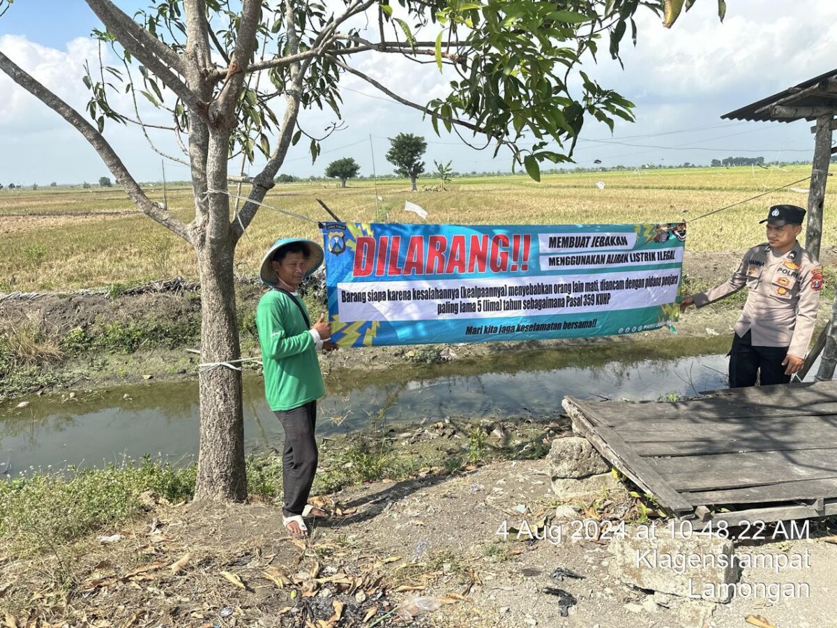Kabar1lamongan.com, 04/08/2024 – Polsek jajaran Polres Lamongan telah memasang banner himbauan terkait larangan penggunaan aliran listrik ilegal untuk jebakan hama tikus di sawah.