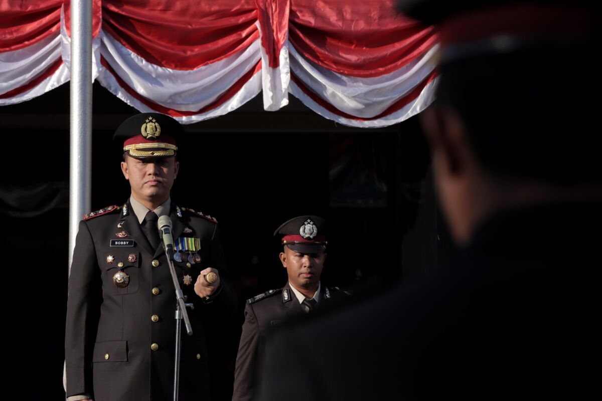 Dalam upacara ini, Kapolres Lamongan bertindak sebagai Inspektur Upacara, didampingi oleh Wakapolres Lamongan Kompol Akay Fahli, S.Kom., S.I.K., M.Si., serta jajaran Pejabat Utama (PJU) Polres Lamongan, perwira dan brigadir, serta lima Aparatur Sipil Negara (ASN) Polres Lamongan.