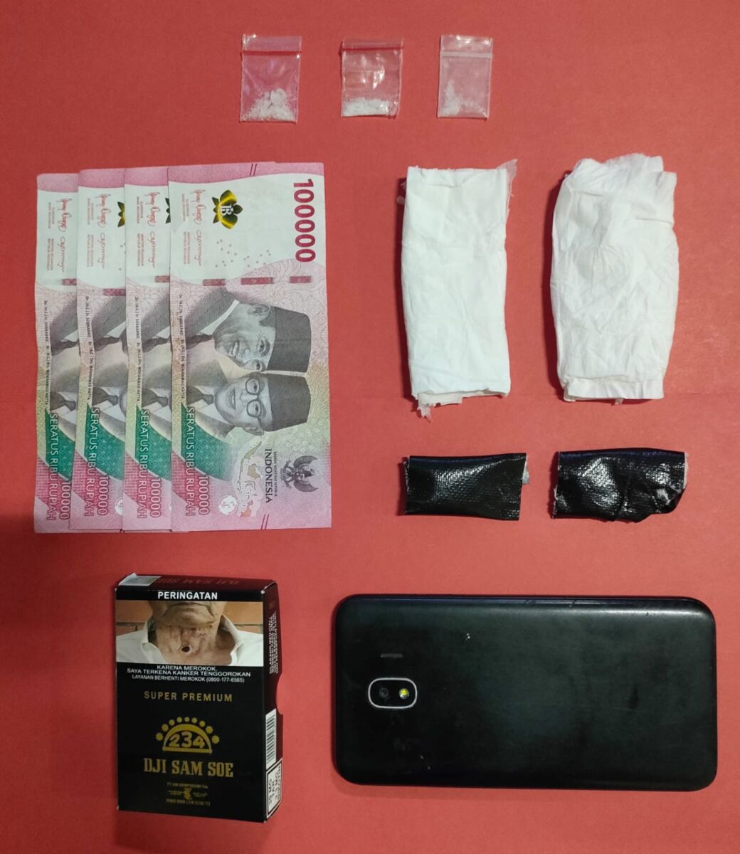 “Setelah dilakukan penggeledahan, petugas menemukan barang bukti berupa tiga klip plastik berisi sabu dengan berat total ± 1,06 gram, satu bungkus rokok merek Djisamsoe, dua buah solasi warna hitam, dua buah tisu warna putih, uang tunai sebesar Rp 400.000, serta satu unit handphone merek Samsung warna hitam.” jelasnya.