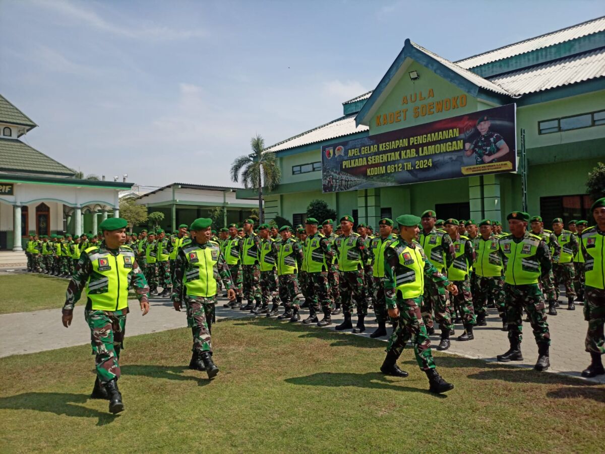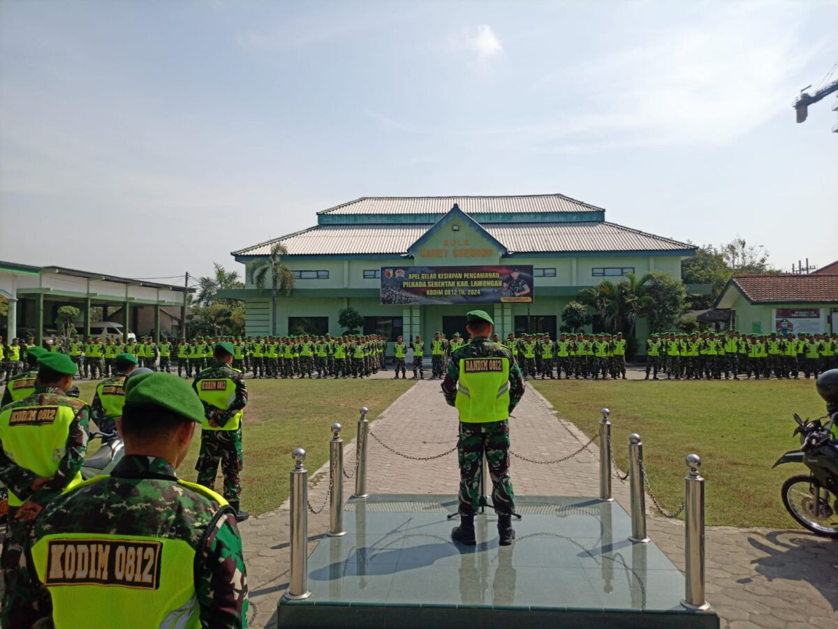 Lamongan, Kabar1lamongan.com – Dalam rangka mengecek kesiapan personel maupun sarana dan prasarana pendukung di dalam menghadapi Pilkada Serentak 2024, Kodim 0812/Lamongan melaksanakan Apel Gelar Pasukan Pengamanan Pilkada serentak Kabupaten Lamongan Tahun 2024, yang bertempat di Lapangan Makodim 0812 Lamongan, Kamis (22/08/2024).