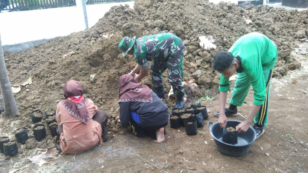dalam hal ini Serka Suzaki mengajarkan anggota Pramuka Sakawira Kartika dalam hal memanfaatkan lahan yang ada dengan budidaya sayuran buah buahan dengan media tanam polybag.