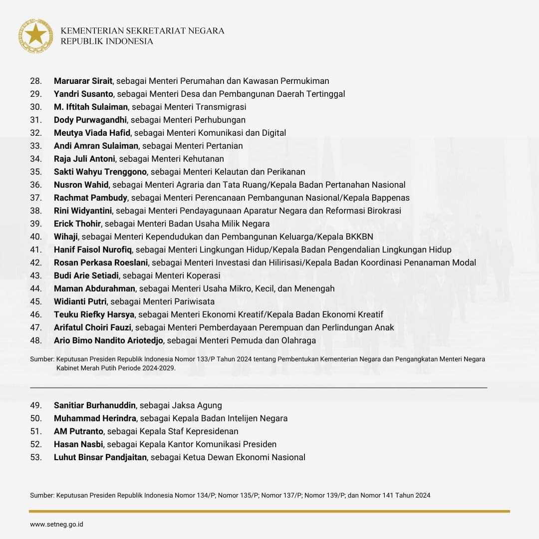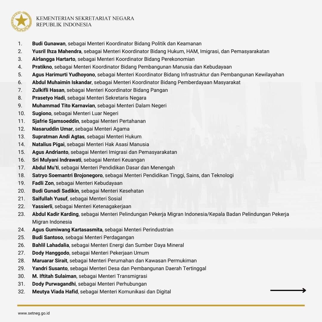 Berikut ini daftar menteri dan kepala badan setingkat menteri Kabinet Merah Putih Prabowo-Gibran yang diumumkan Minggu (20/10/2024):