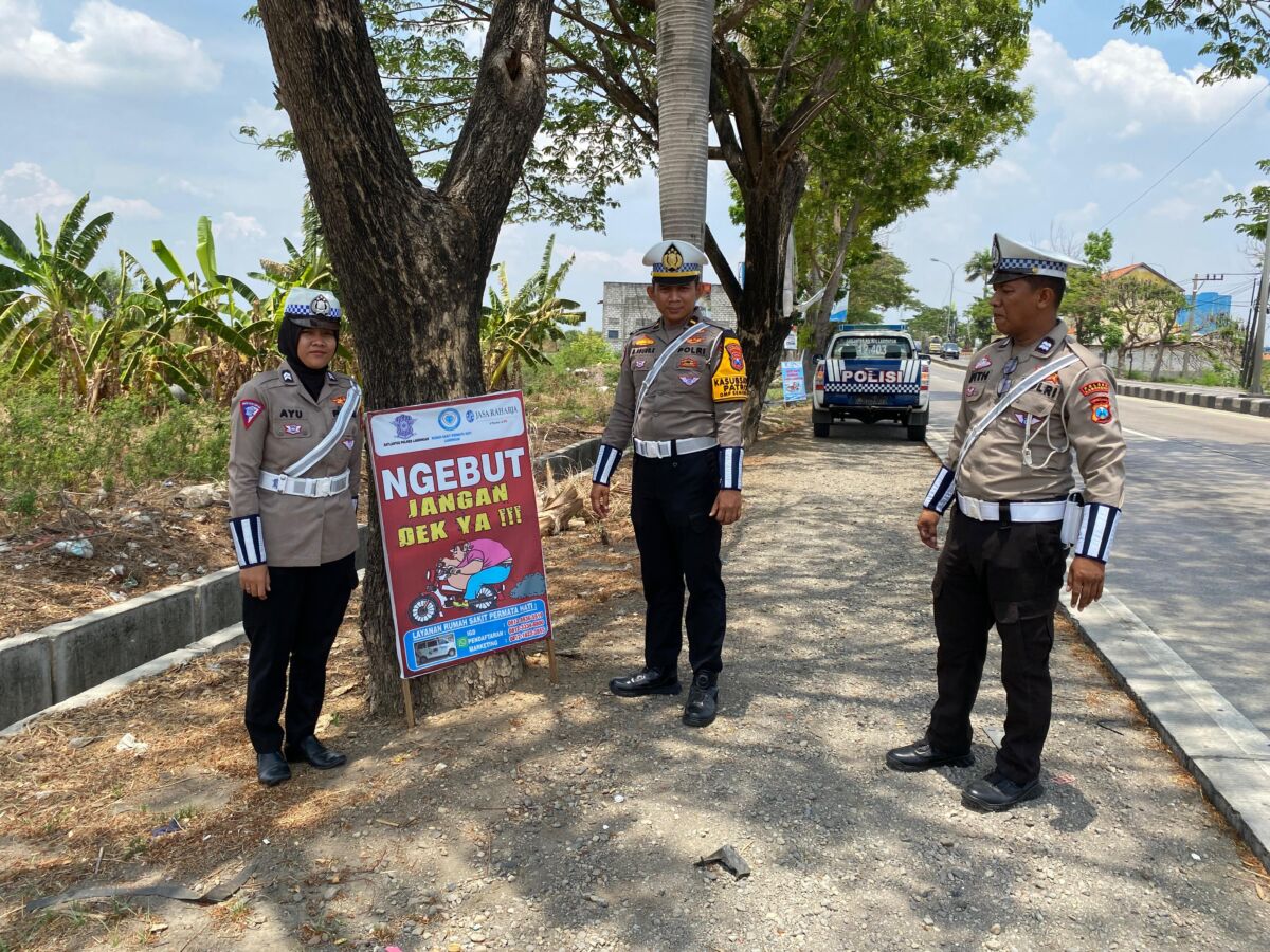 Satlantas Polres Lamongan Pasang dan Cek Banner Himbauan di Jalur Rawan Laka
