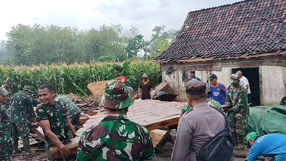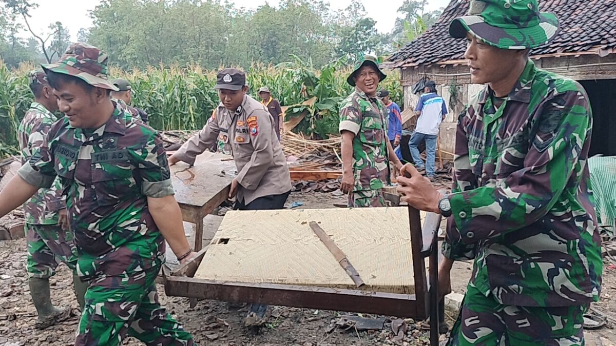 TNI Jajaran Kodim 0812 Lamongan Bersama Muspika dan Warga Gotong Royong Bersihkan Rumah yang Roboh Akibat Puting Beliung
