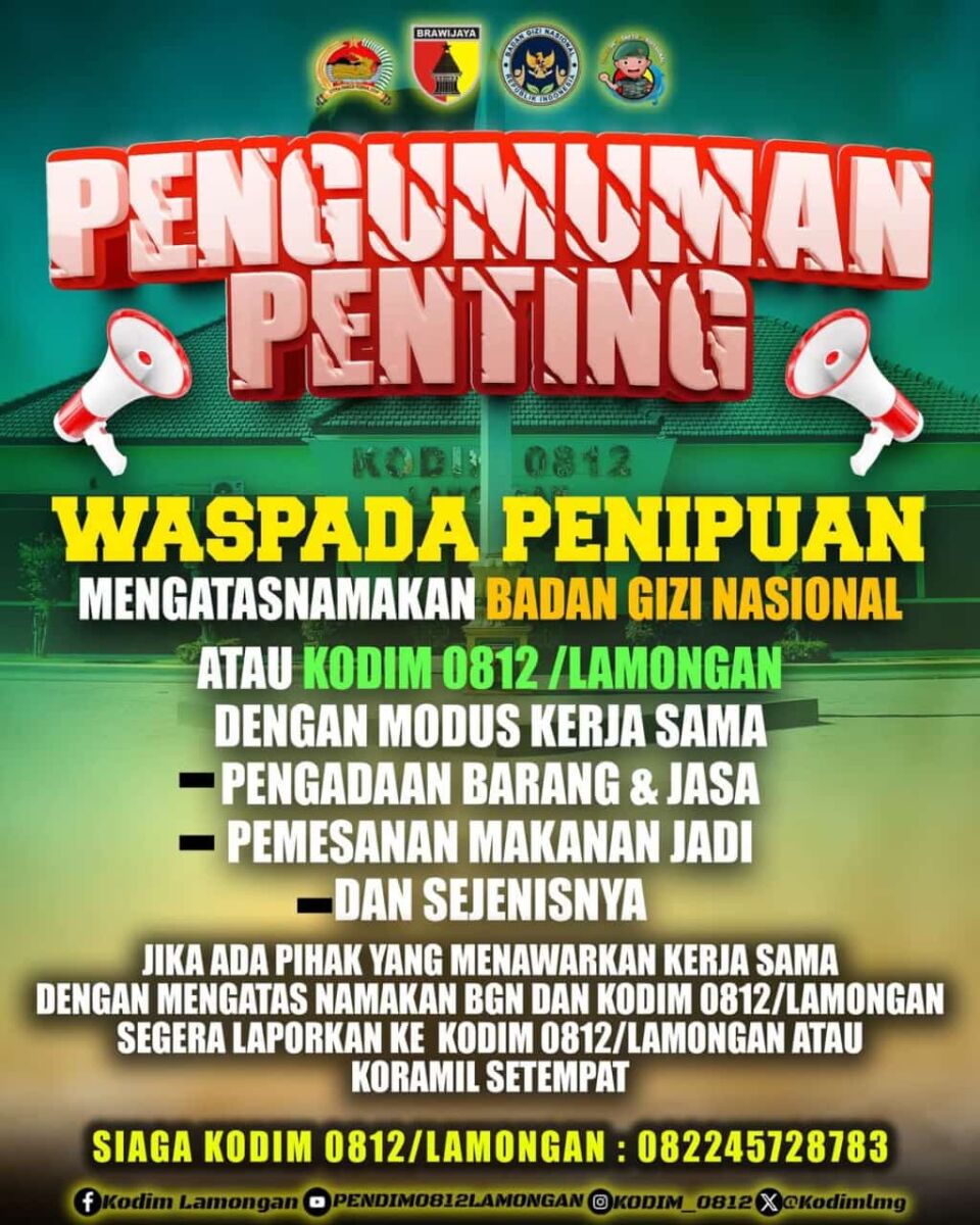 “Jika ada pihak yang menawarkan kerja sama dengan mengatasnamakan BGN dan Kodim 0812 Lamongan, segera laporkan ke Kodim 0812 Lamongan atau ke Koramil setempat,” ujar Letkol Arm Ketut Wira Purbawan.