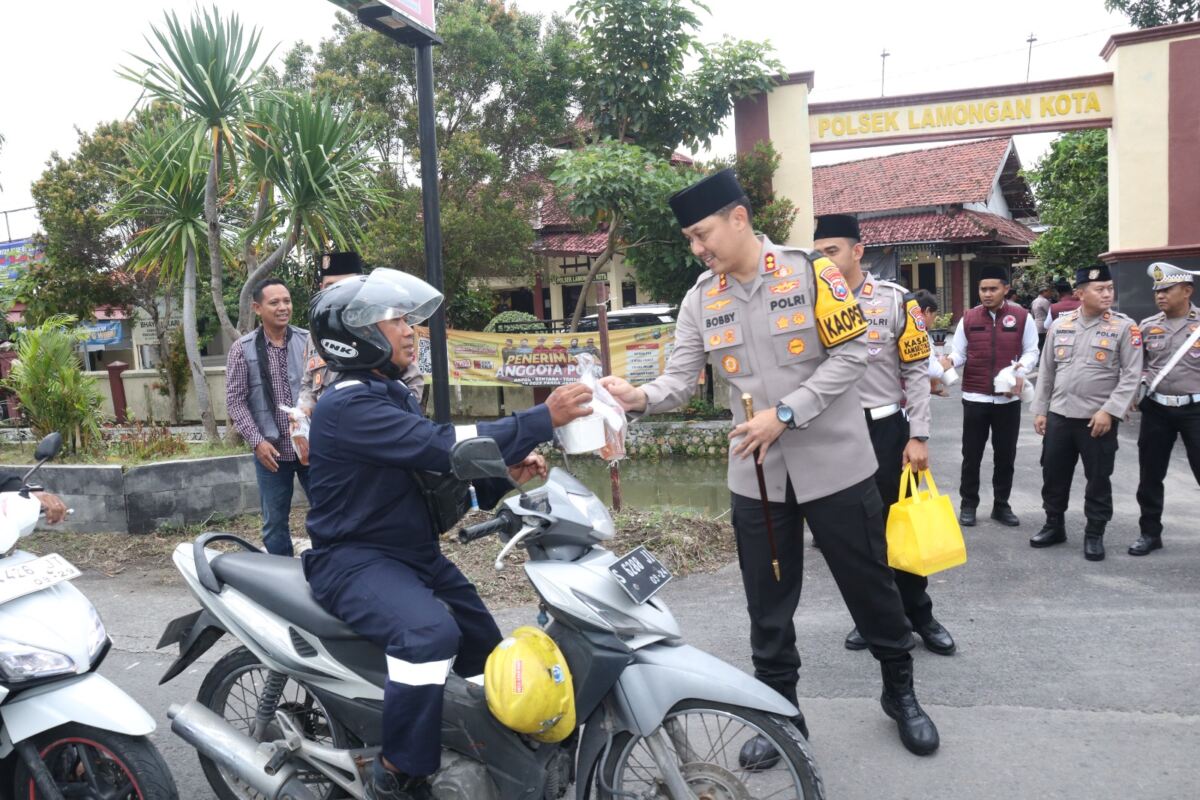 Dalam kegiatan ini, Kapolres bersama personel Polres Lamongan dan Polsek Lamongan Kota membagikan ratusan paket takjil kepada pengendara motor, mobil, serta pejalan kaki yang melintas di depan Mapolsek.