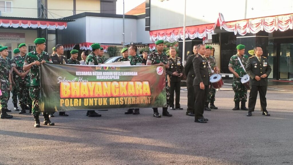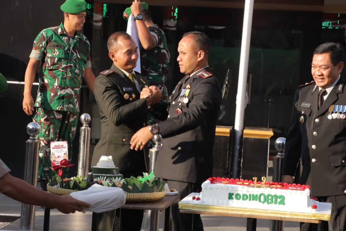 Dengan diiringi korsik dan didampingi Perwira Staf serta segenap Anggota Kodim 0812/Lamongan, Dandim mendatangi Mapolres Lamongan, sambil membawa tumpeng dan kue tart yang bertemakan HUT Bhayangkara ke-79.