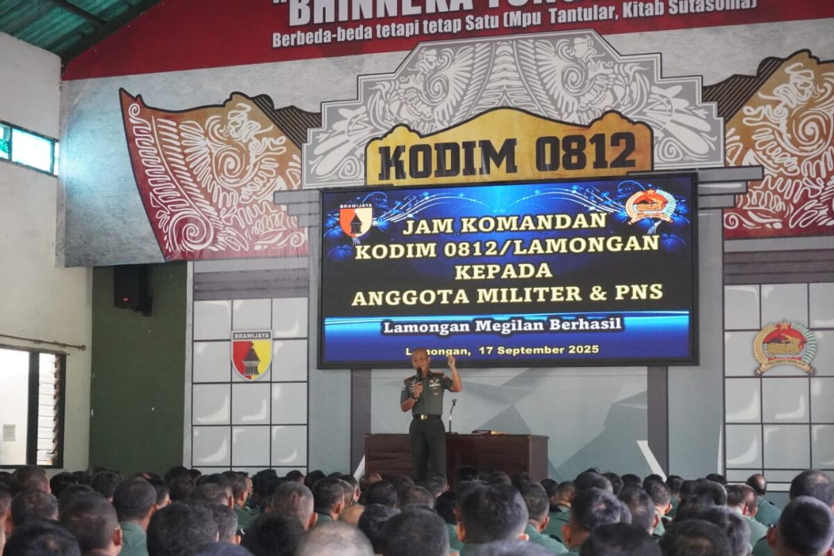Kabar1lamongan.com – Komandan Kodim 0812/Lamongan, Letkol Inf Deni Suryo Anggo Digdo memimpin upacara 17 September 2025 di lapangan upacara Makodim 0812/Lamongan sekaligus memberikan Jam Komandan kepada seluruh anggota Kodim 0812/Lamongan baik Prajurit maupun PNS TNI. Kegiatan jam Komandan dilaksanakan di Aula Kadet Soewoko Kodim 0812/Lamongan, Rabu (17/09/2025).