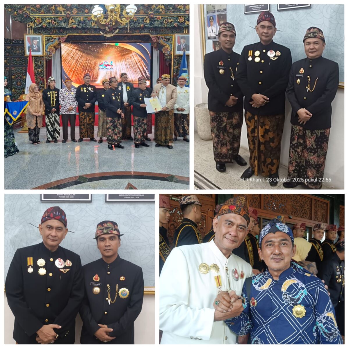 Keterangan: DPD MATRA Kabupaten Lamongan yang juga Ketua HKMA Himpunan Kerabat Mangkualaman), KRT (Kanjeng Raden Tumenggung) Harun Setiawan Dirjo Kusumo Hadiri Puncak Peringatan Hari Jadi Kabupaten Bangkalan ke 494. Berikan Udeng Singomengkok ke Bupati Bangkalan. Kamis, (23/10/2025), Foto: IST.