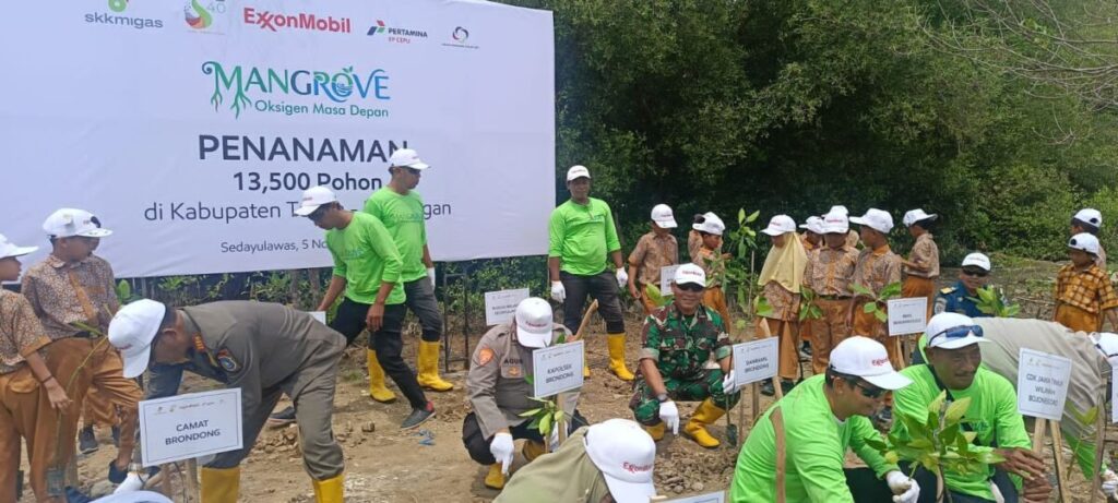 Kabar1lamongan.com – Komitmen kuat terhadap pelestarian lingkungan yang keberlanjutan di masa depan diwujudkan melalui aksi penanaman 13.500 pohon Mangrove dalam tema”Bersatu dengan alam untuk Indonesia maju” yang di laksanakan di kawasan pesisir Desa Sedayulawas, Kecamatan Brondong, Kabupaten Lamongan. Kegiatan ini merupakan inisiatif kolaboratif yang melibatkan TNI jajaran Kodim 0812 Lamongan melalui koramil 0812/18 Brondong, yang mana Peltu Karyanto selaku Pj Danramil 0812/18 Brondong bersama PT ExxonMobil Cepu Limited (EMCL) Bojonegoro, Perhutani wilayah Tuban, Lamongan, Gresik, Surabaya, Dinas Lingkungan Hidup (DLH) Kabupaten Lamongan, Forkopimcam Brondong, serta masyarakat Rukun Nelayan Desa Sedayulawas.
