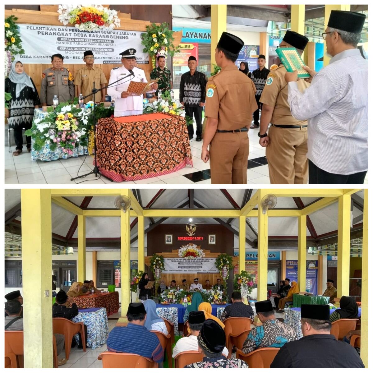 “Kegiatan Pelantikan dan pengambilan sumpah, janji Perangkat Desa Karanggeneng untuk jabatan Kepala seksi kesejahteraan dan Kepala dusun Karanggeneng,” Ungkap Elli Susiantoro, S.E., Kades Karanggeneng kepada awak media.