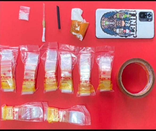 Dari hasil penggeledahan, petugas menemukan 1 (satu) plastik klip berisi Narkotika golongan I bukan tanaman jenis sabu dengan berat kotor ± 0,44 gram, sobekan tisu, isolasi warna cokelat, serta 1 (satu) unit handphone yang diduga digunakan untuk aktivitas peredaran narkotika.