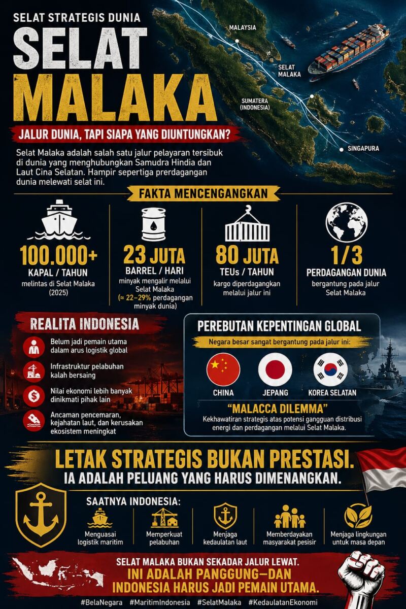 Kabar1Lamongan.com – Di peta dunia, Selat Malaka tampak seperti garis sempit di antara Pulau Sumatra dan Semenanjung Malaysia. Namun dalam realitas global, ia adalah denyut nadi perdagangan internasional, jalur yang menghidupi industri, menggerakkan energi, dan menentukan stabilitas ekonomi kawasan Asia. Ironisnya, di tengah peran sebesar itu, Indonesia kerap terlihat seperti penonton di halaman rumahnya sendiri.